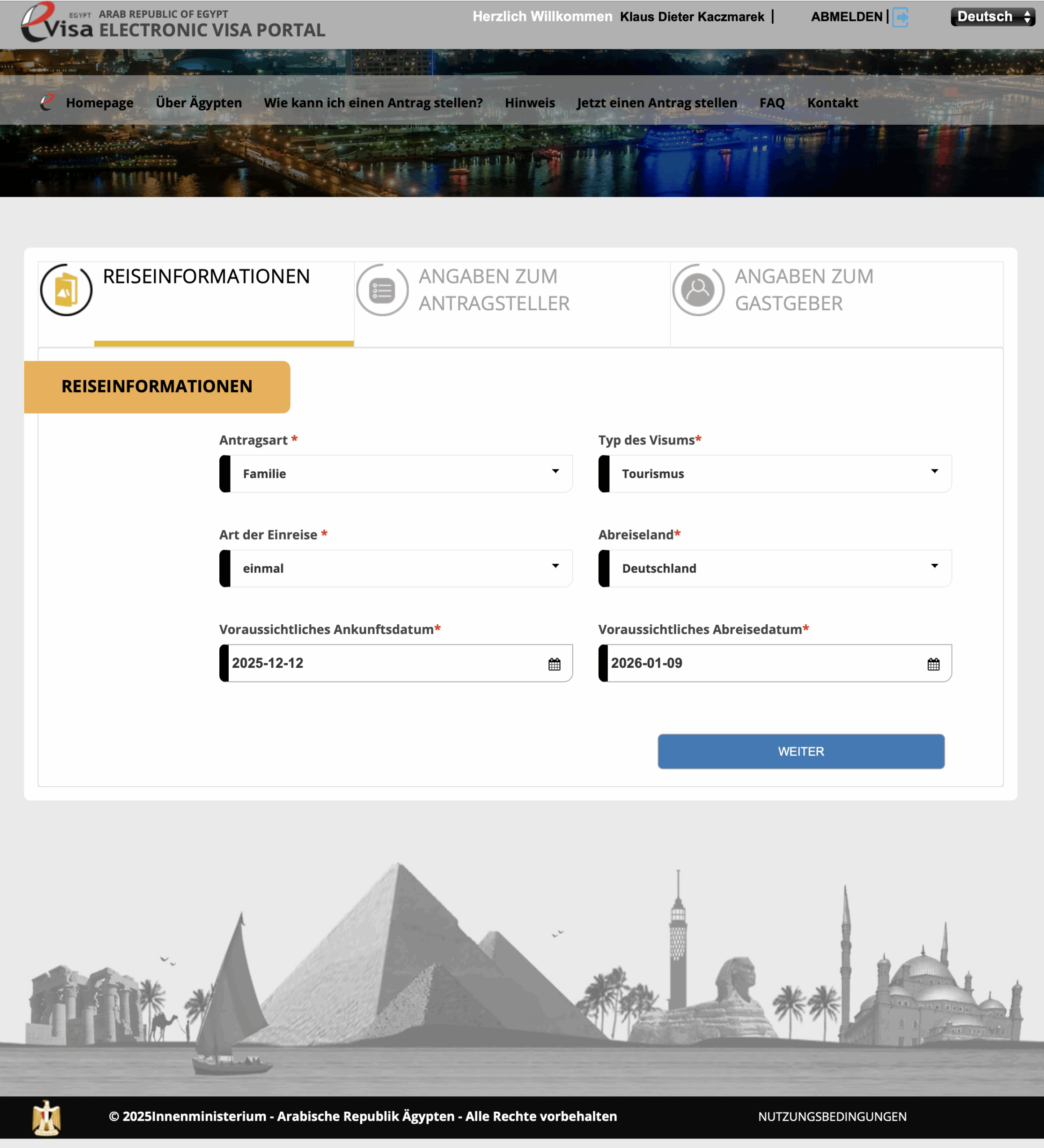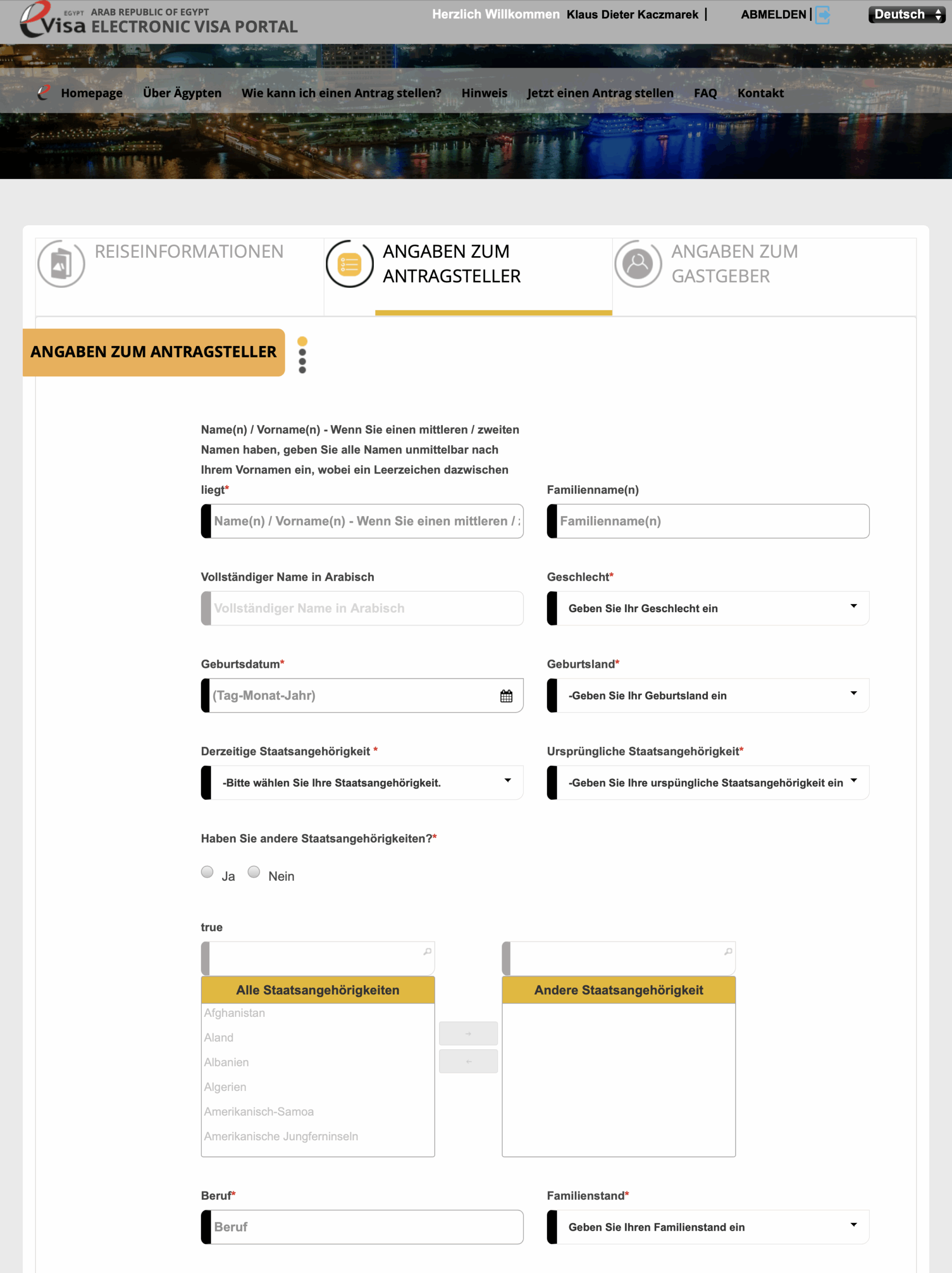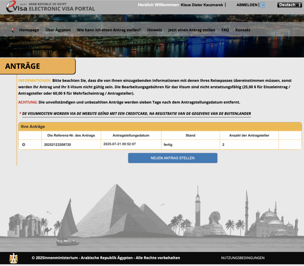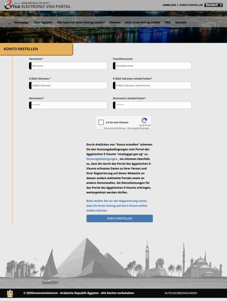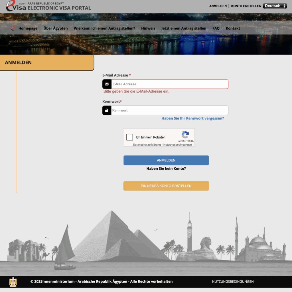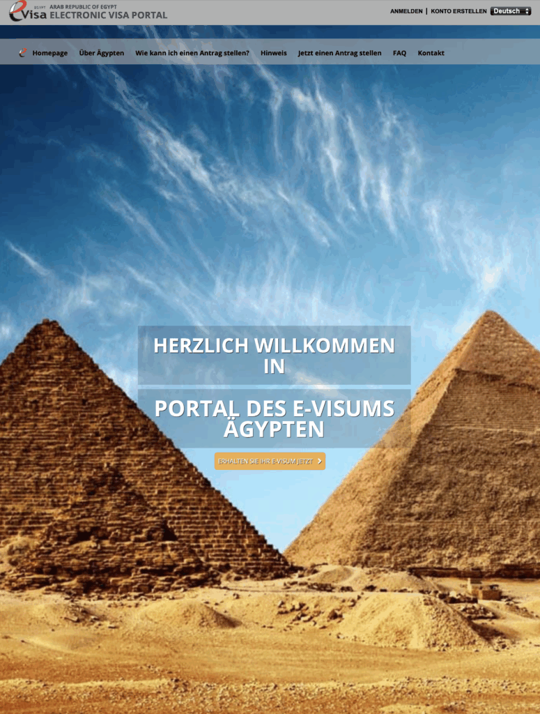 Hier ist der offizielle Link zur offiziellen Seite für das ägyptische E-Visum, bitte benutzt kein anderes, es könnten FAKE Seiten sein, oder Broker die überteuerte Gebühren verlangen.